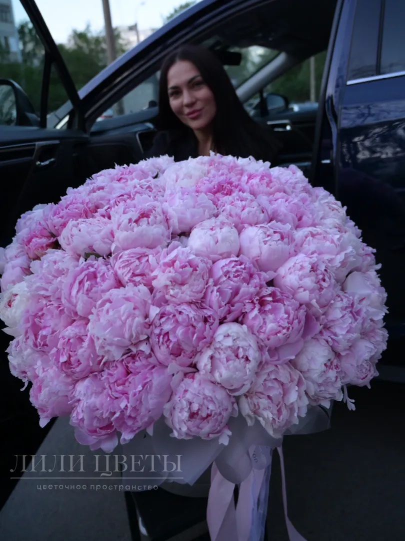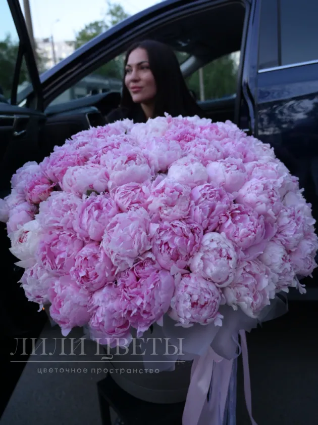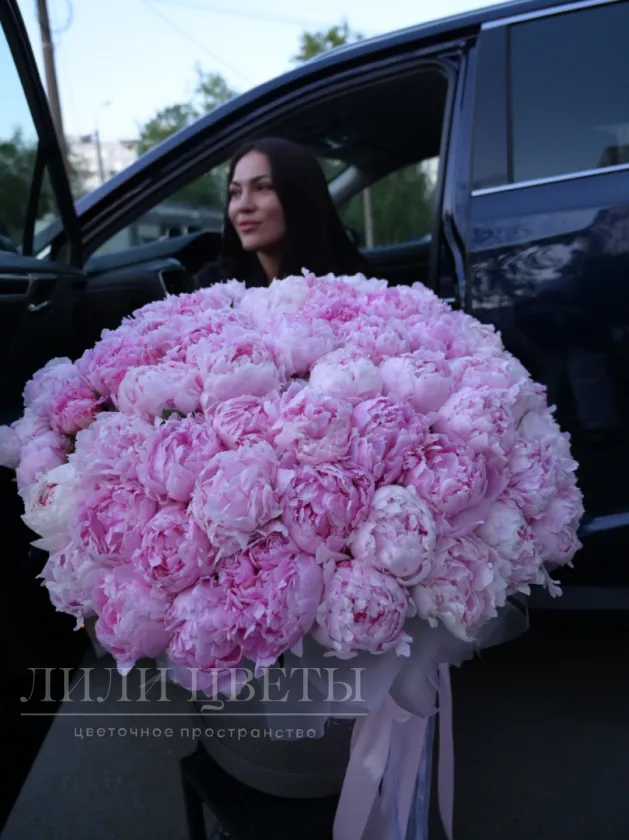 Композиция в шляпной коробке из 71 пиона восхищает своей роскошью и изяществом.
