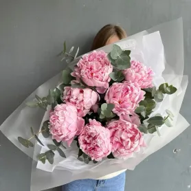 Букет из нежно-розовых пионов с эвкалиптом