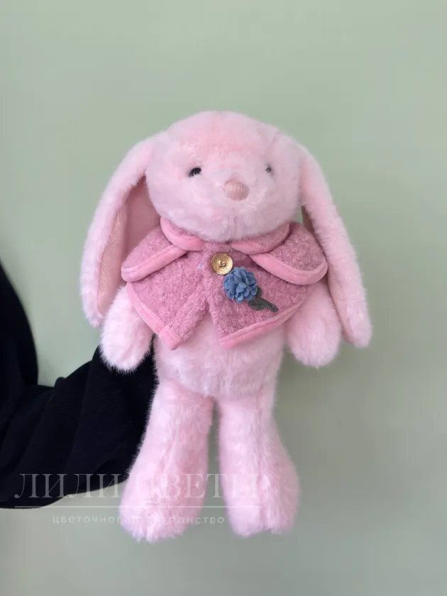 Мягкая игрушка зайчик с розовой накидкой вдохновляет на ласковые объятия и добрые моменты.
