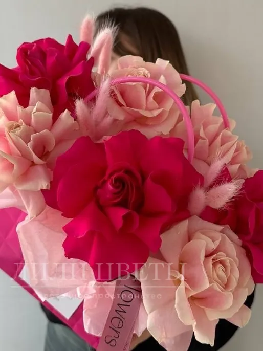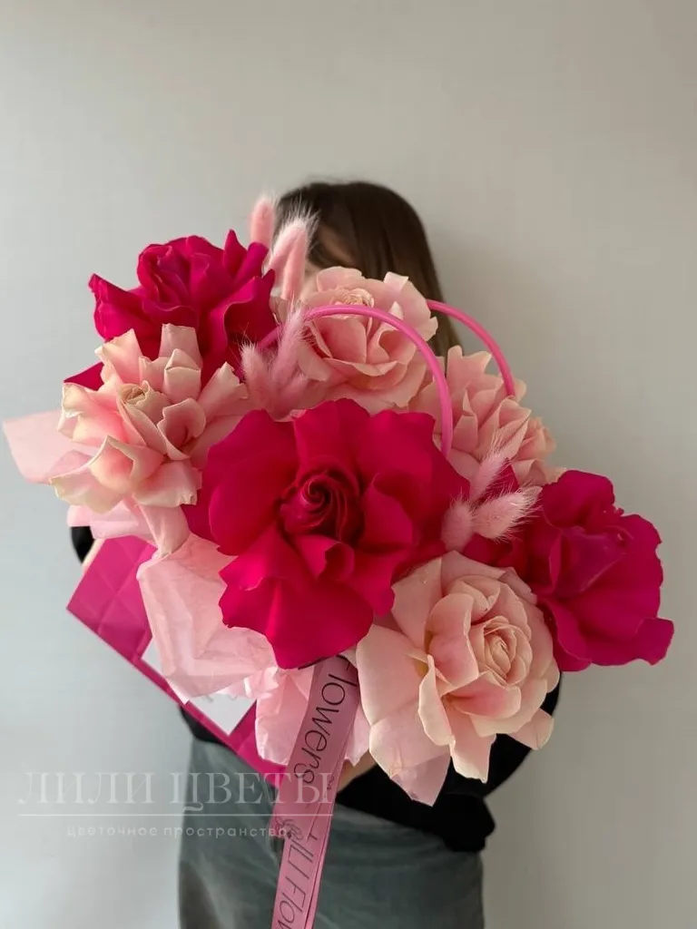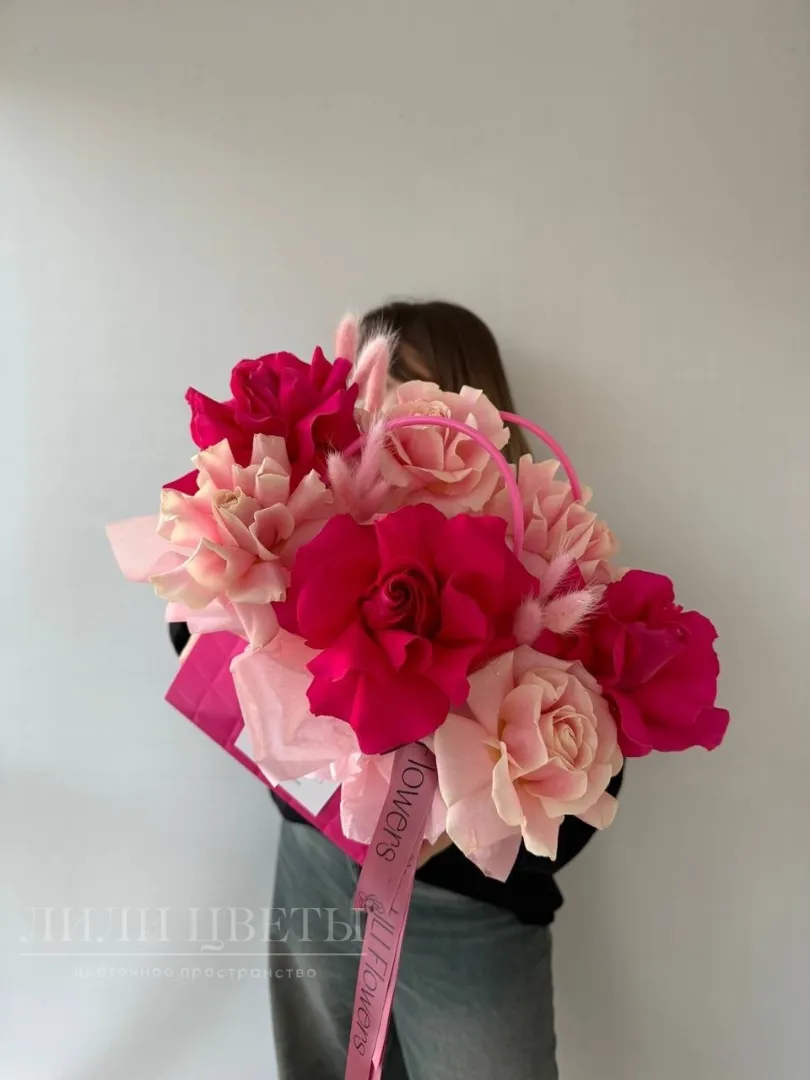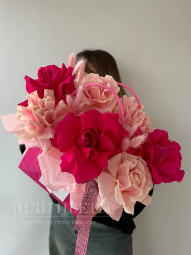 Композиция в сумочке из розовых и малиновых ажурных роз