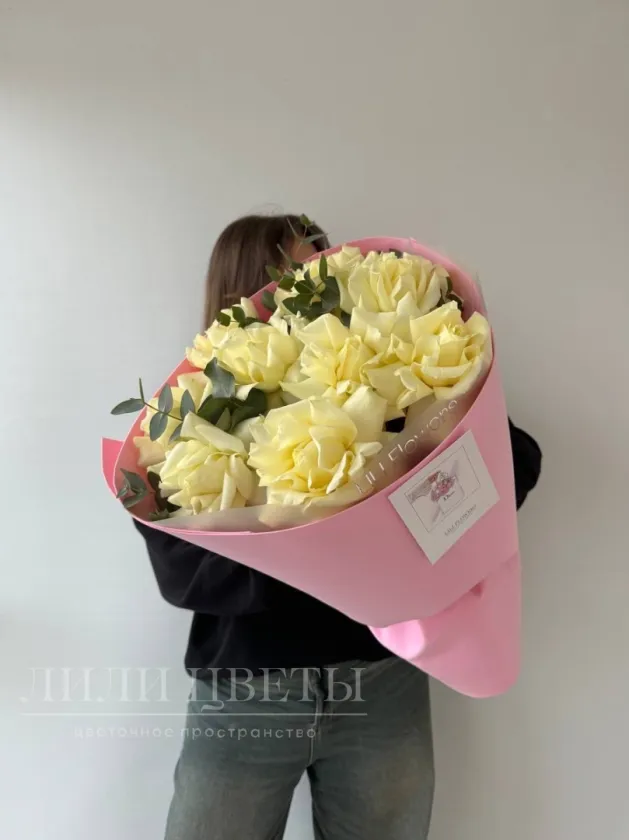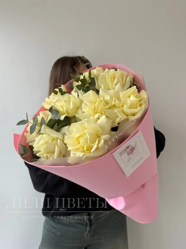 Монобукет из белых ажурных роз с эвкалиптом