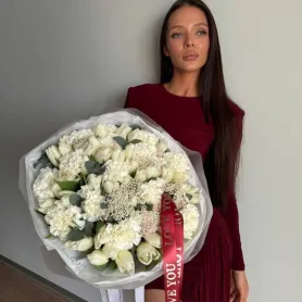 Сборный букет из белых тюльпанов, диантусов,озатамнуса