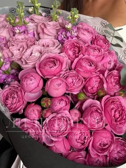 Сборный букет из кустовых и одноголовых роз ,матиоллы и эвкалипта