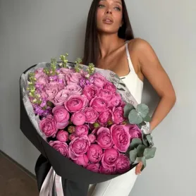 Сборный букет из кустовых и одноголовых роз, маттиолы и эвкалипта