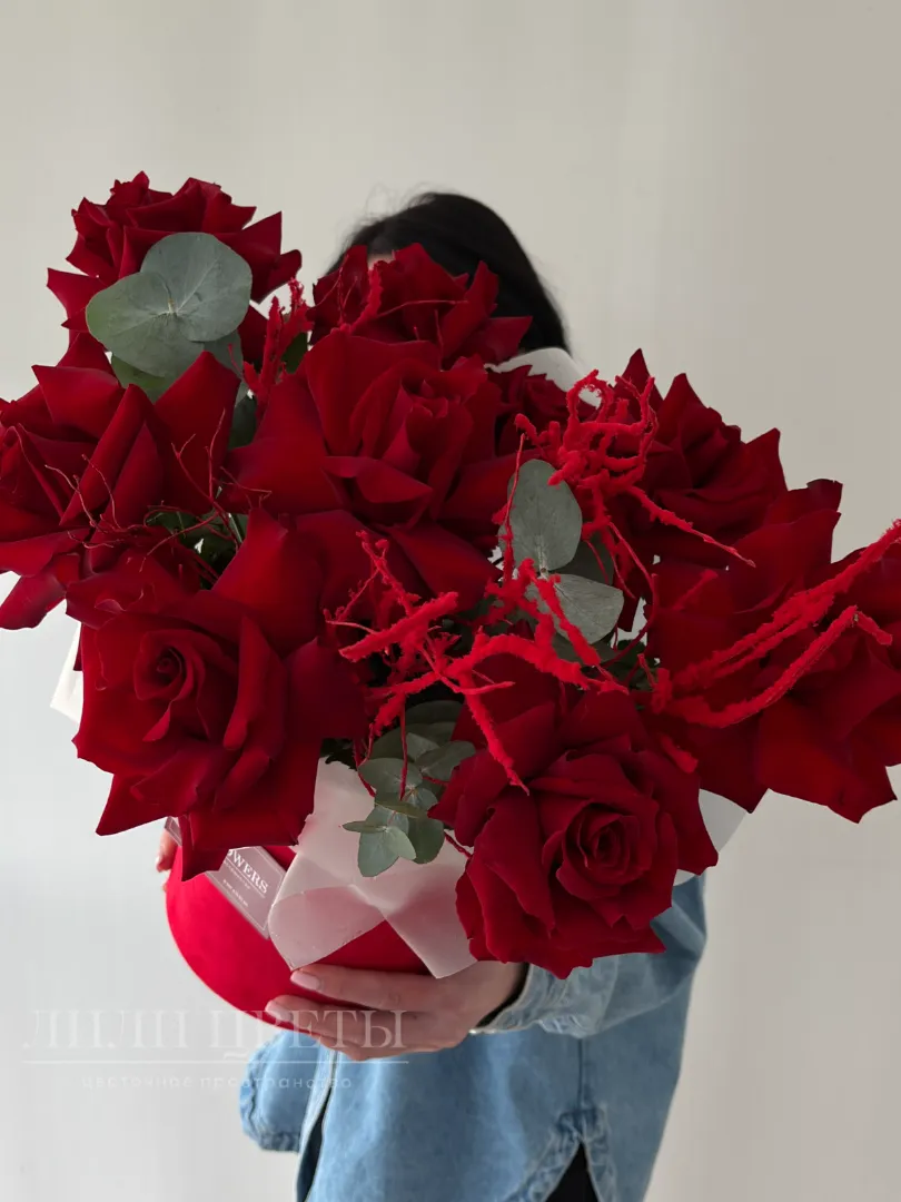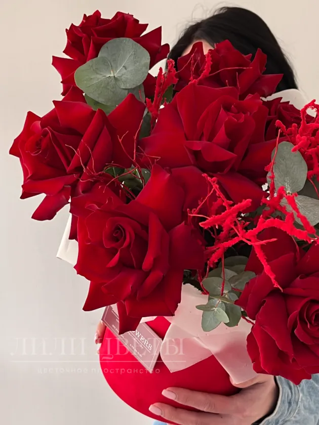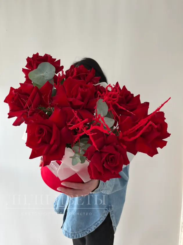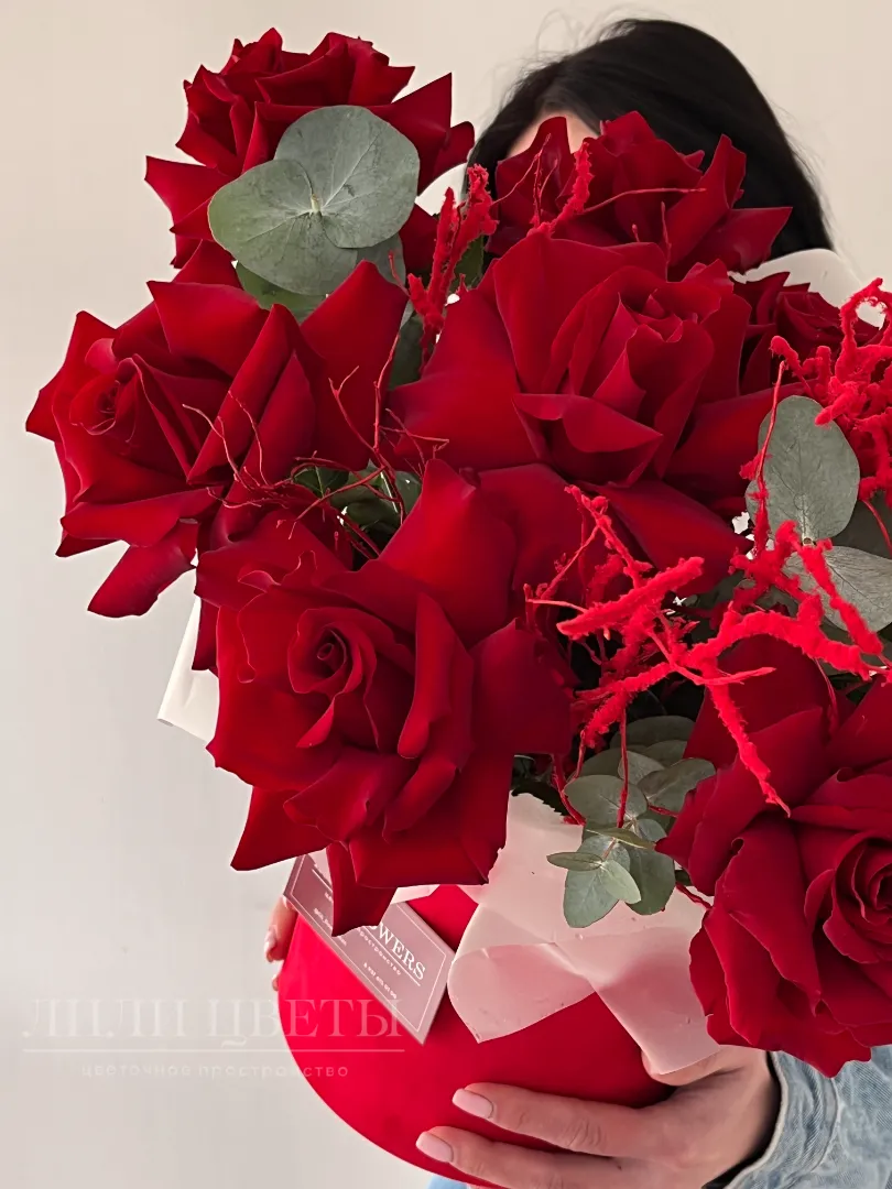 Яркая композиция из ажурных роз с эвкалиптом