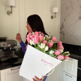 В состав букета входят белые и розовые тюльпаны в крафт-боксе