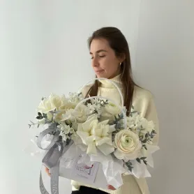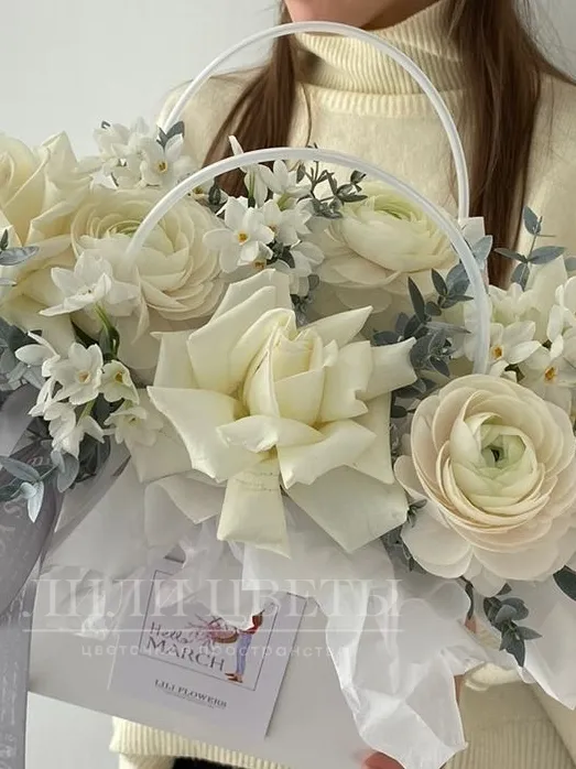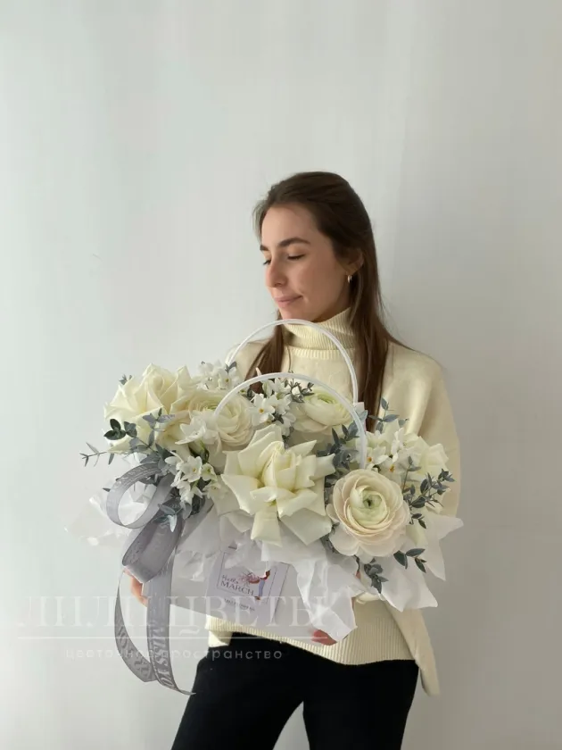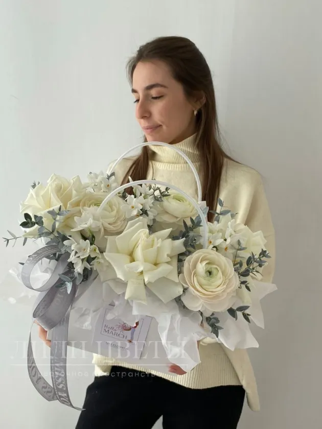 Композиция в сумочке с ранункулюсами