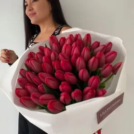 Букет из 51 красного тюльпана в белом оформление