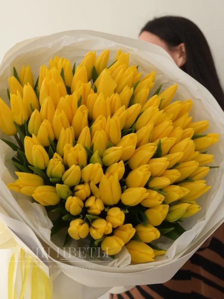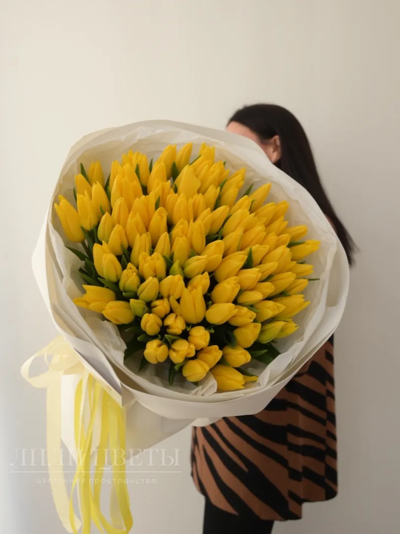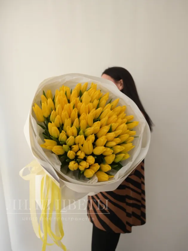 Букет из 101 желтого тюльпана в белом оформление
