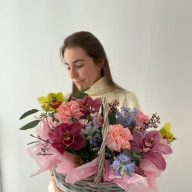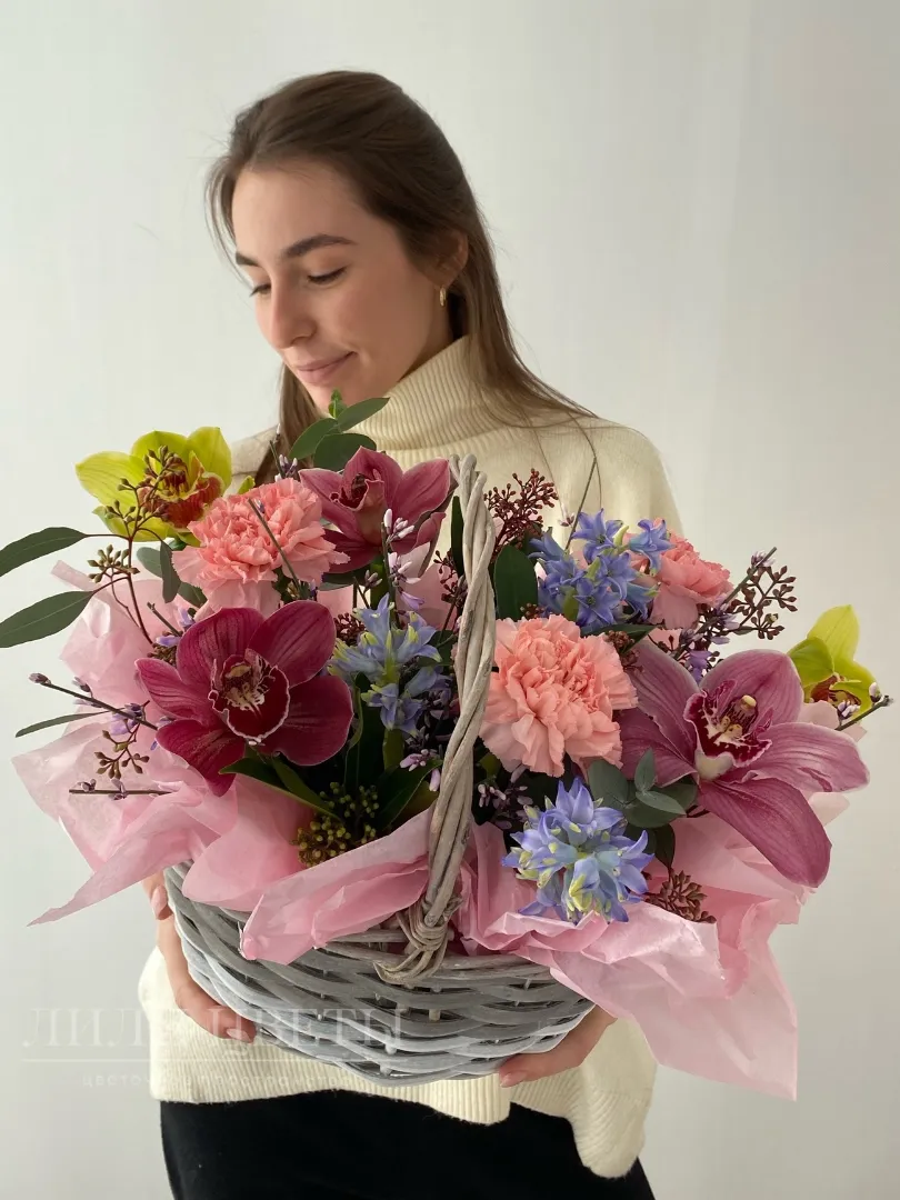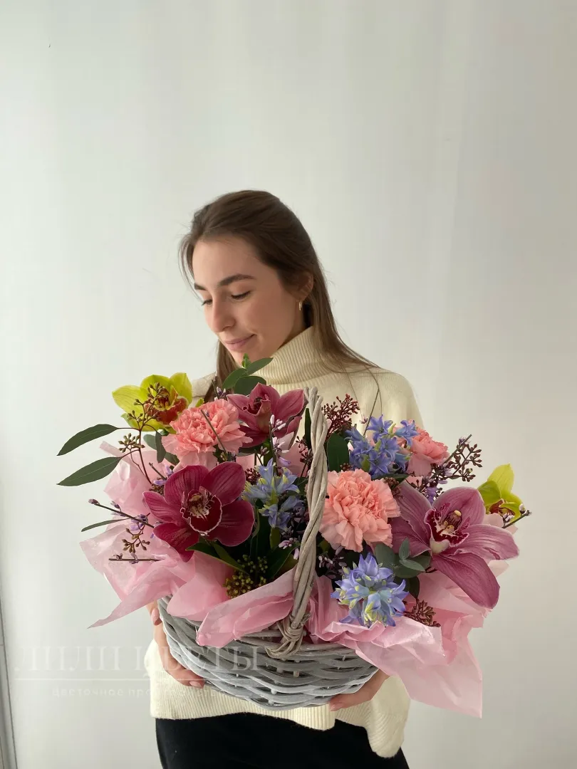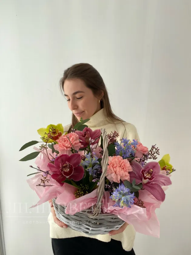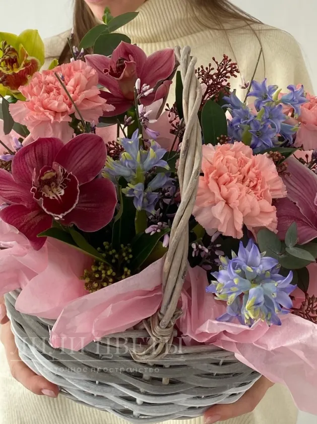 Композиция в корзине из орхидей с диантусами