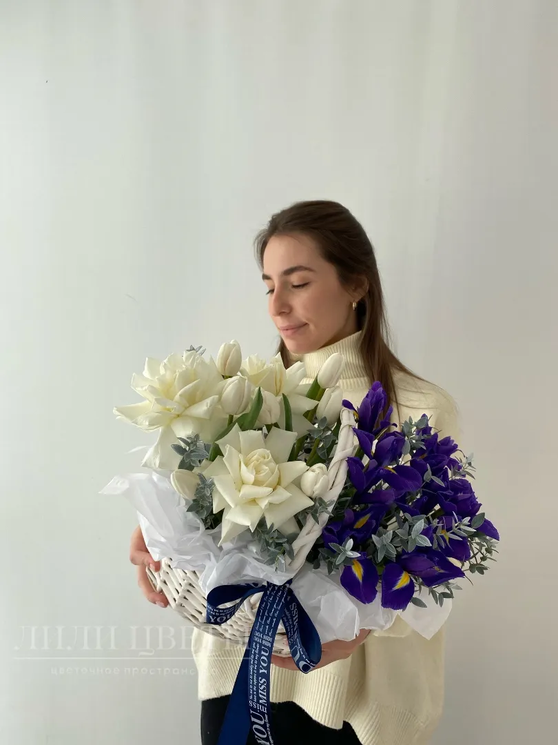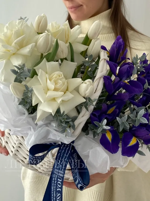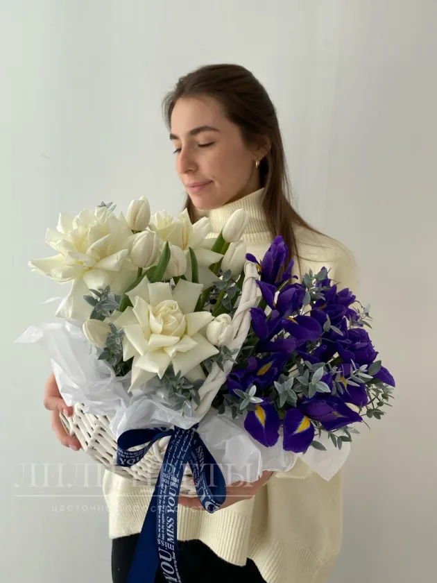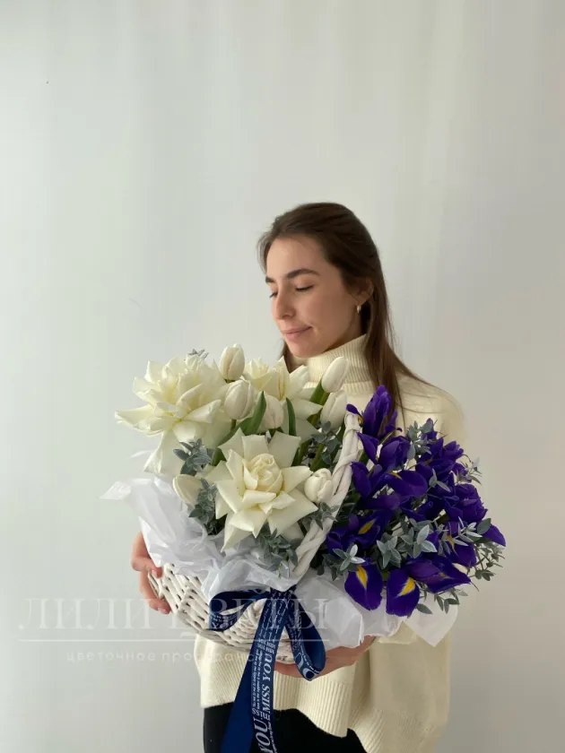 Композиция в корзине из белых роз и ирисов