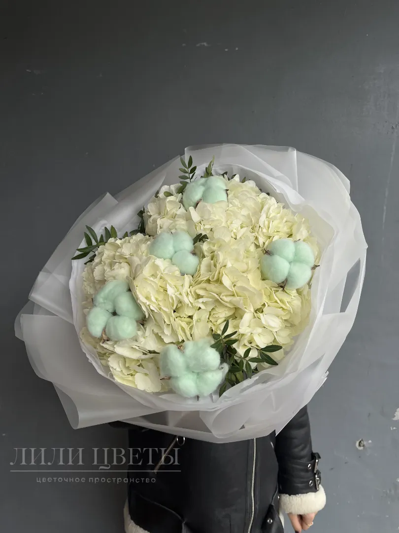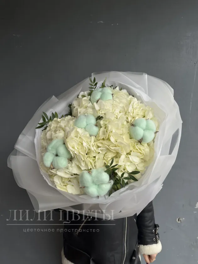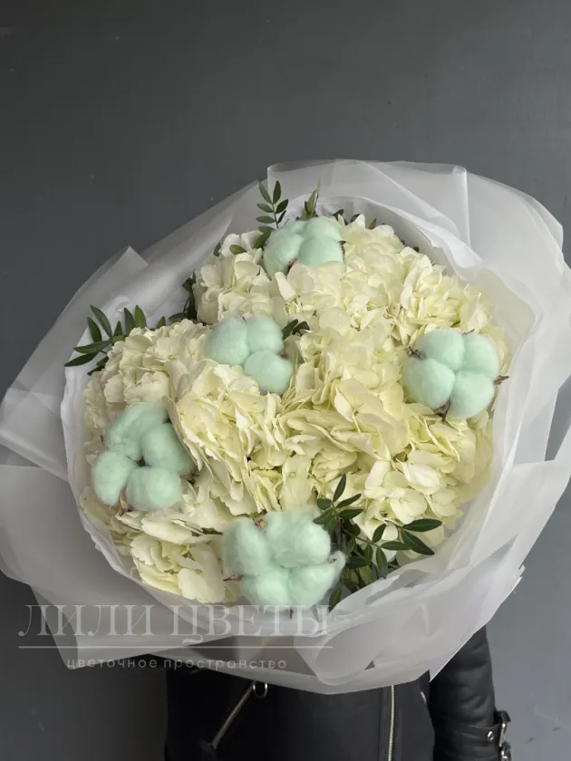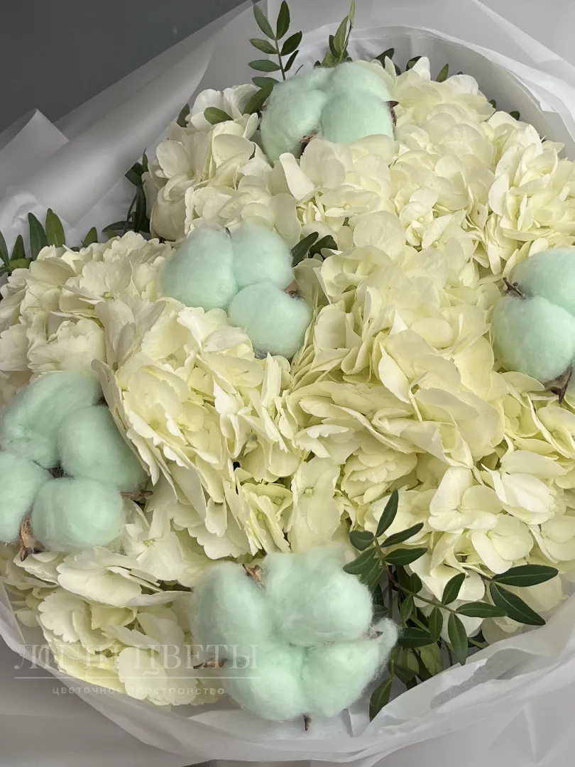 Букет из белых гортензий с голубым хлопком