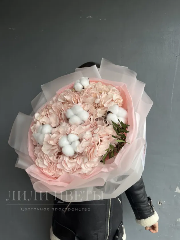 Букет из розовых гортензий с белым хлопком