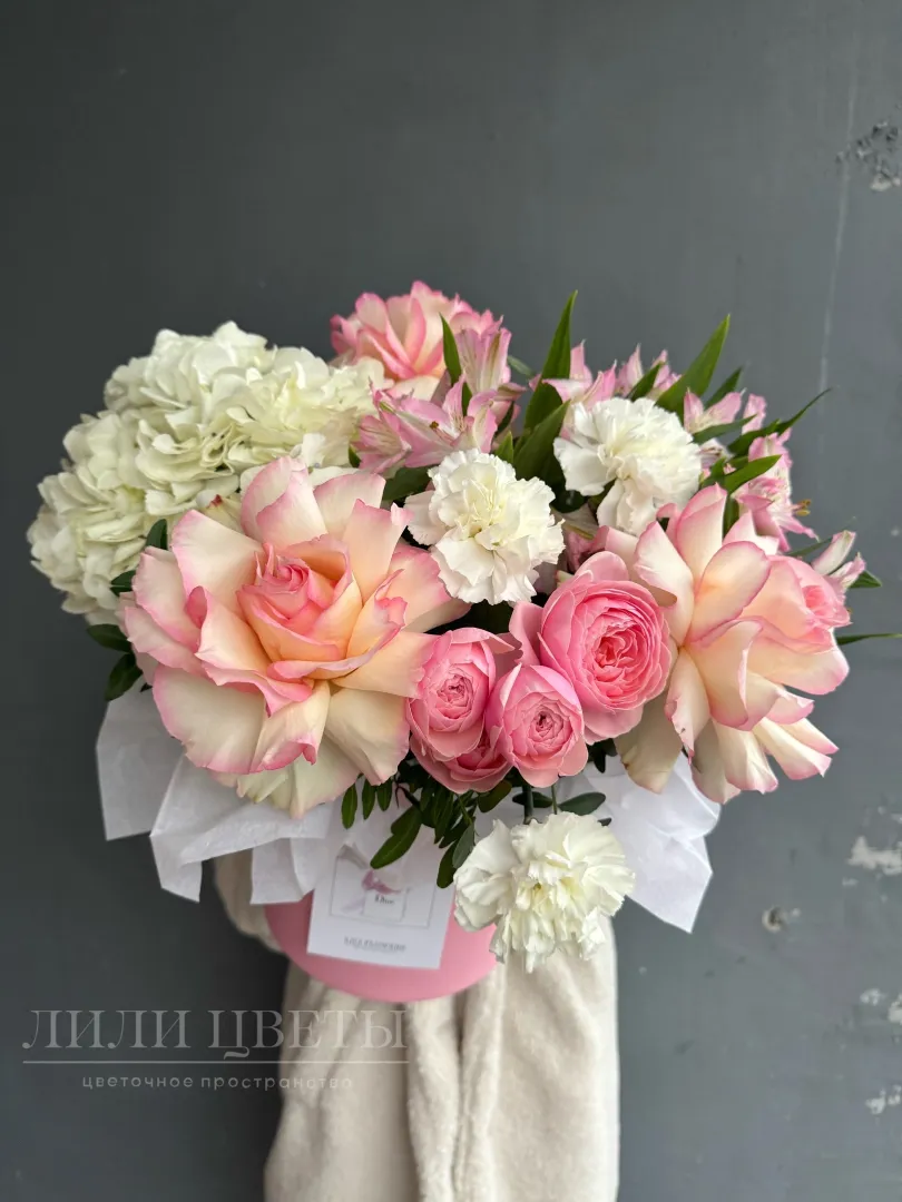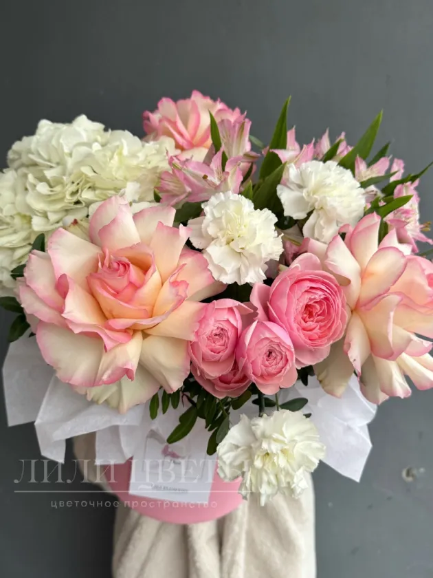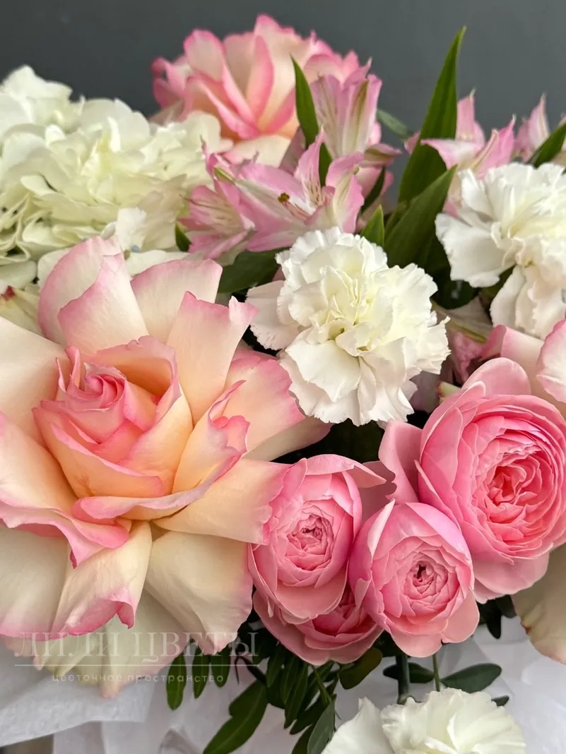 Нежная композиция с ажурными розами,кустовой розой,диантусами