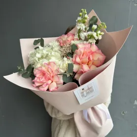 Сборный заказ из ажурных роз,гортензии,матиоллы,озотамнусом и эвкалиптом