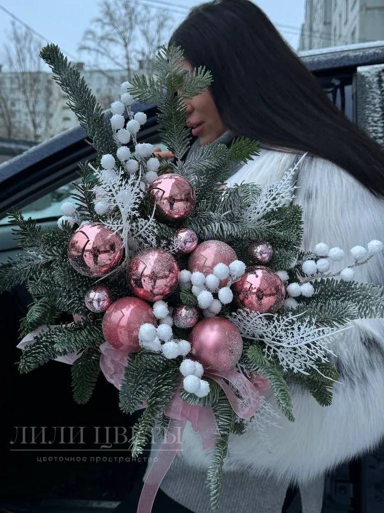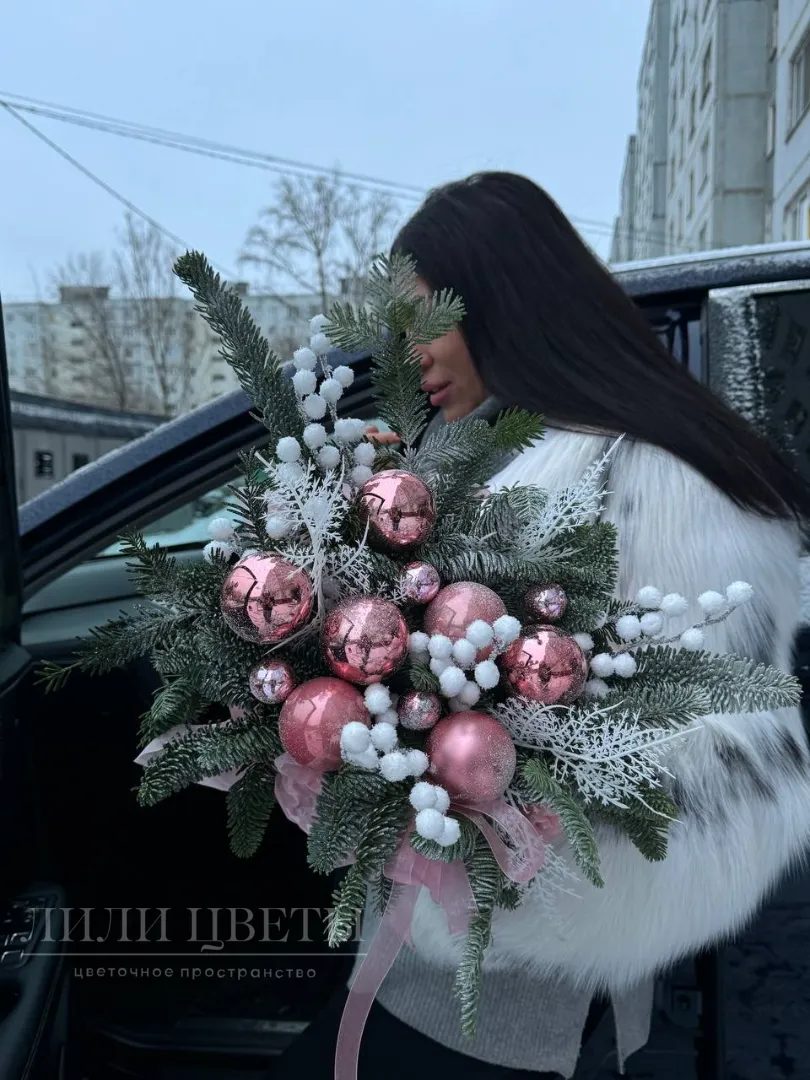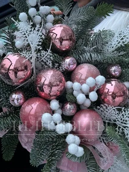 Новогодняя композиция в розовых тонах с шарами