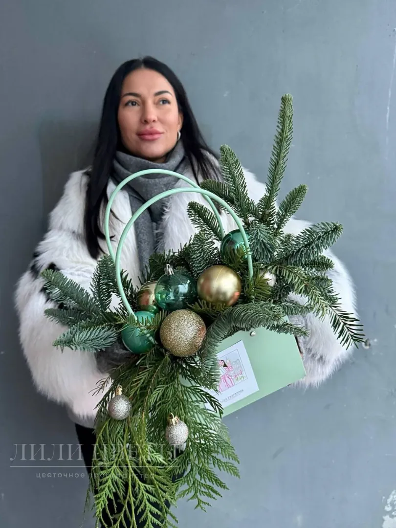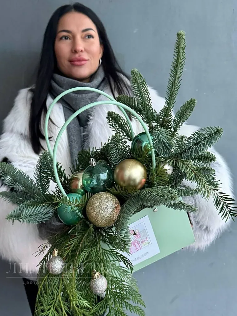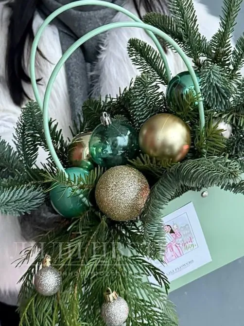 Композиция в сумочке из хвоя с елочными шарами