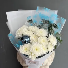 Букет из кустовой хризантемы,хвои и елочного шарика