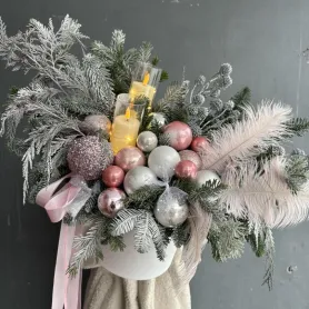 Новогодняя композиция из хвои, шаров, свечей и шишек