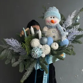 Новогодняя композиция в голубых оттенках со снеговиком