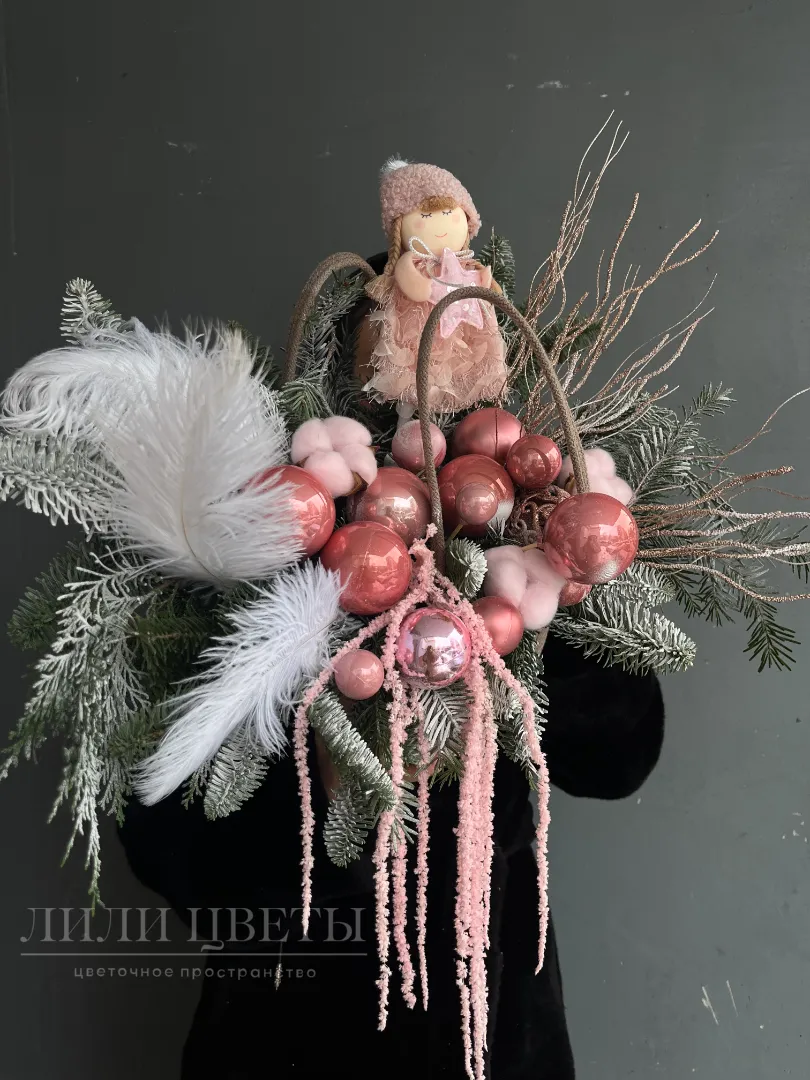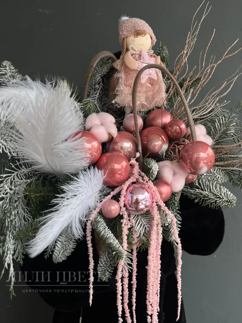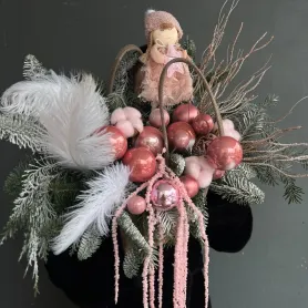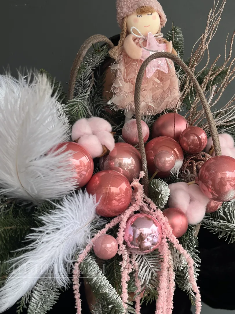 Новогодняя композиция в розовых оттенках с перьями