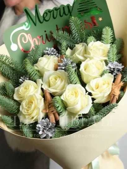 Букет из белых роз, нобилиса и корицы
