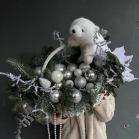 Новогодняя композиция с серебристыми шарами и мишкой