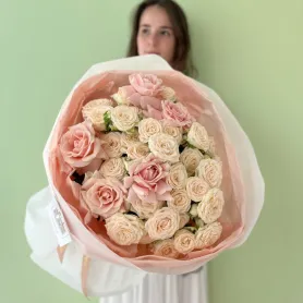 Очаровательный букет из ажурных и кустовых роз - воплощение романтики и нежности. Ажурные розы с их утонченной формой и деликатными лепестками придают букету элегантность, в то время как кустовые розы добавляют объем и насыщенность. Сочетание белых и розовых оттенков создает гармоничный ансамбль, который станет прекрасным подарком для любого случая. Этот букет не только украсит праздник, но и подарит радость, наполняя пространство теплом и счастьем.