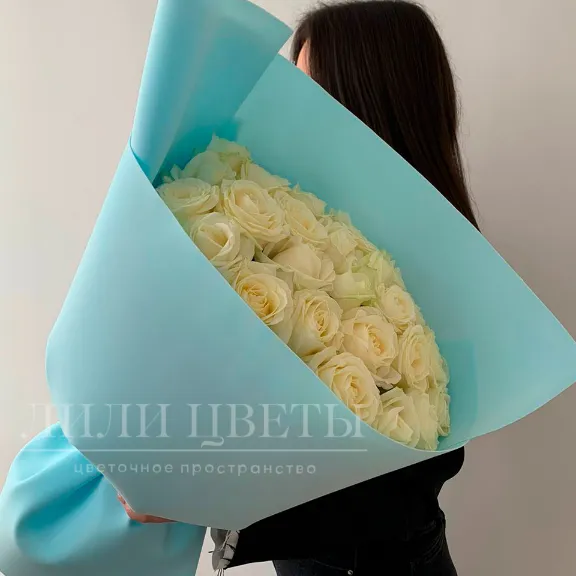 Этот букет из белых роз выглядит нежно и свежо, подчеркивая чистоту и искренность чувств.