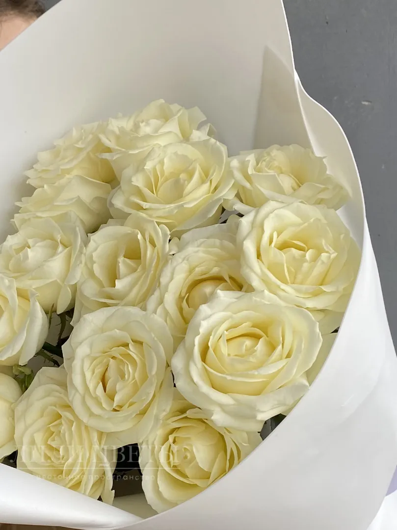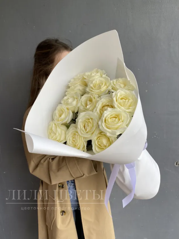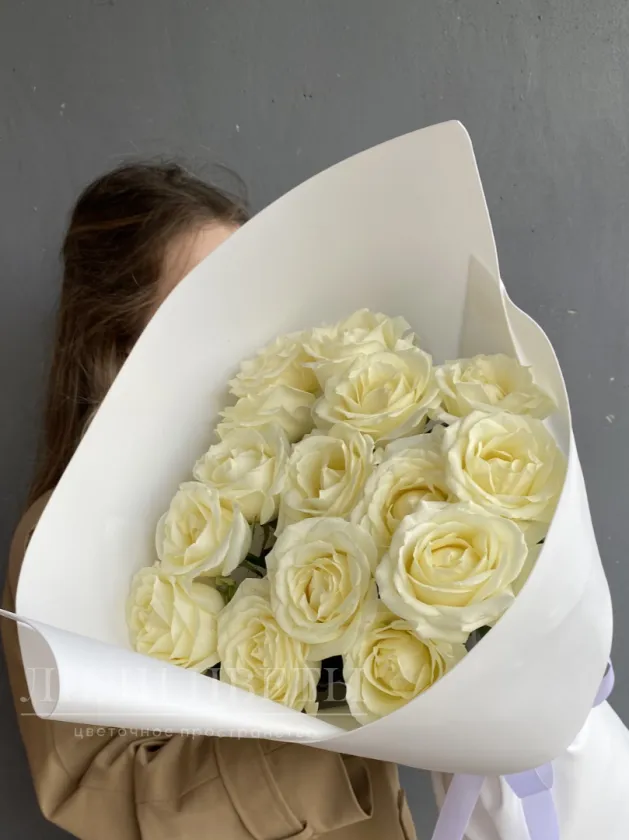 Этот изысканный монобукет состоит из чистых белых роз, окутанных нежным белым фоамираном, создавая непередаваемую атмосферу романтики и изящества.
