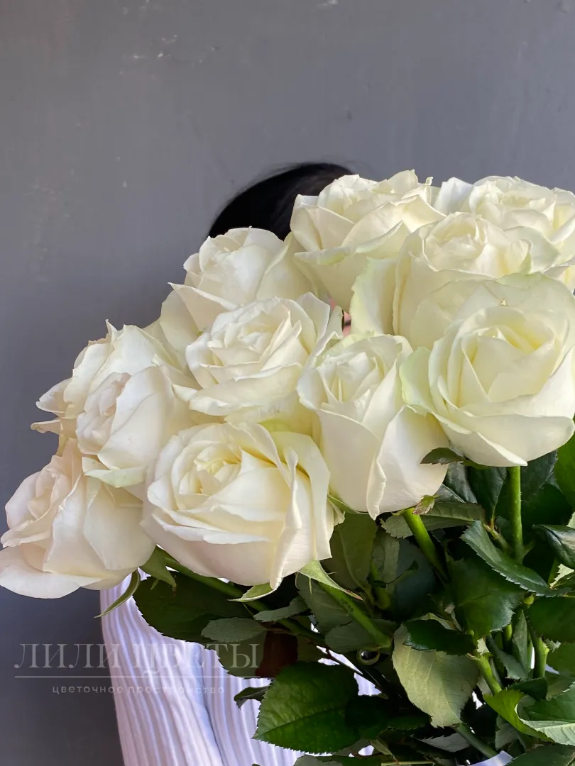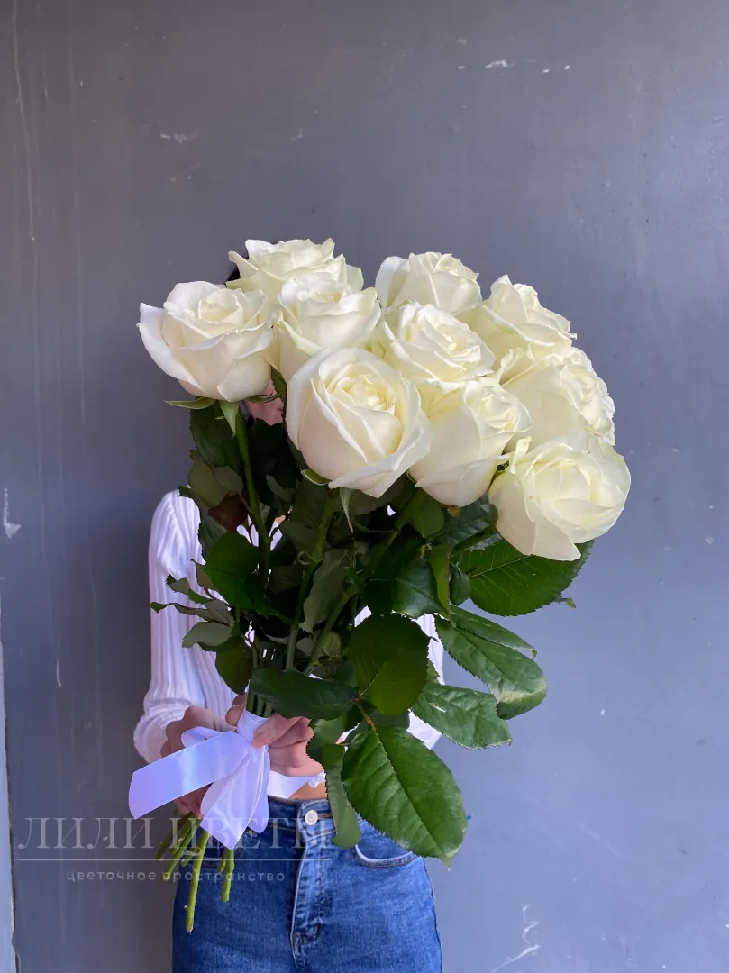 Этот изящный монобукет из чистых белых роз, украшенный нежной лентой, является символом чистой и нежной любви.