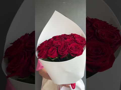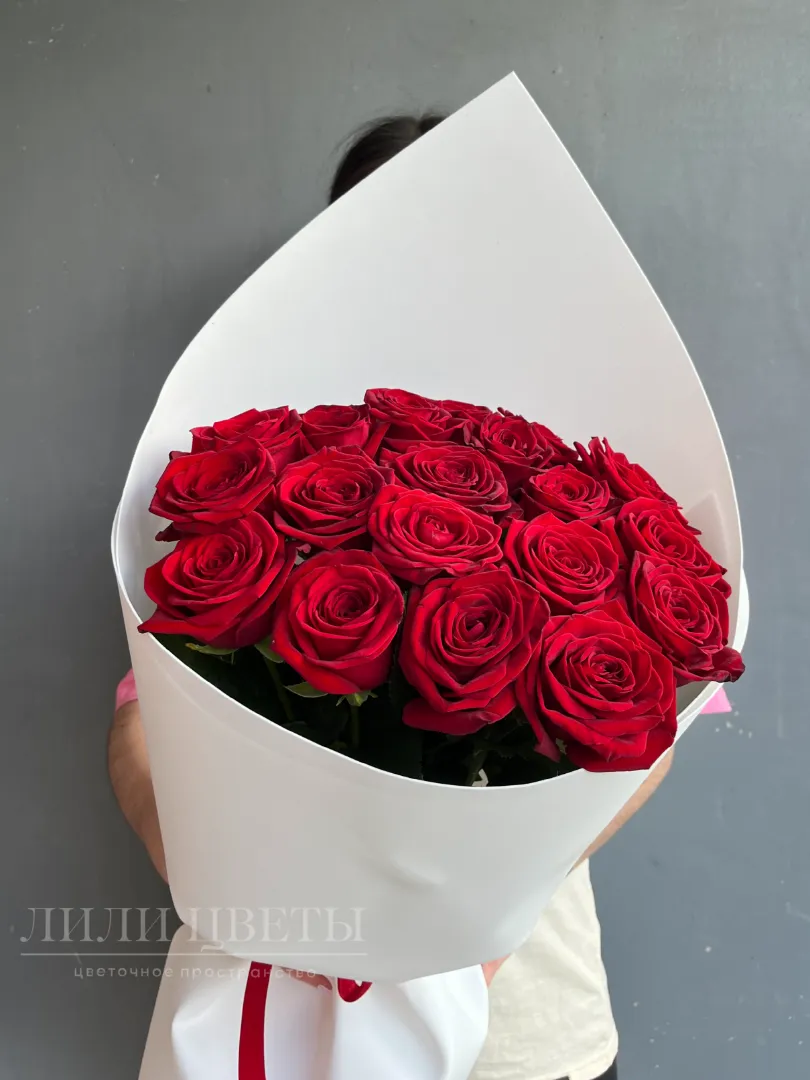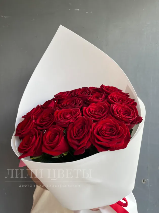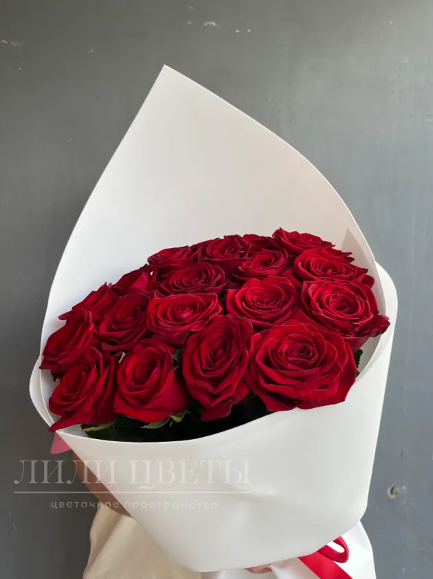 Букет красных роз в белом оформление выглядит изысканно.