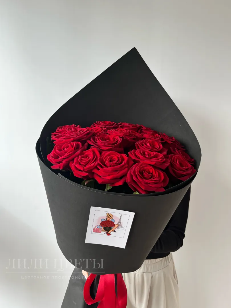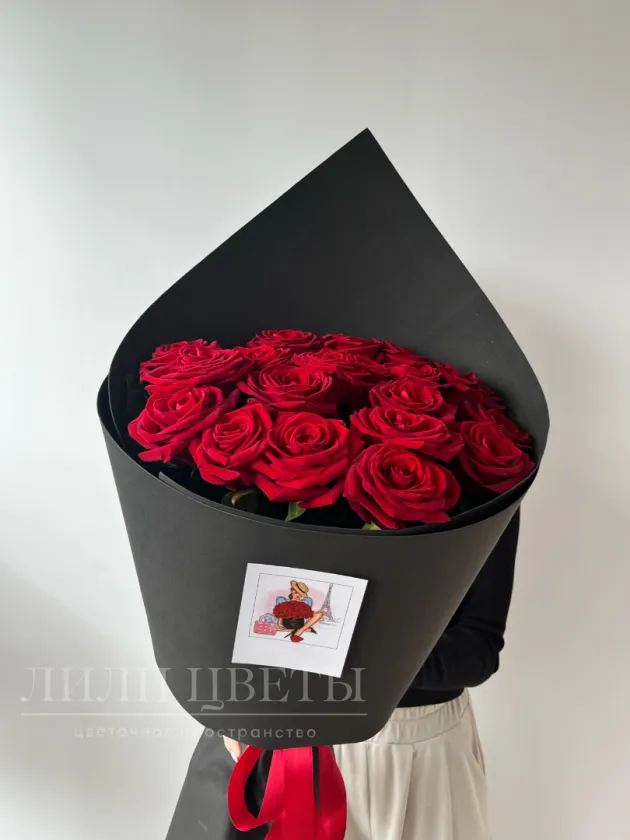 Этот букет красных роз в черном оформлении - это идеальный выбор для тех,кто хочет подчеркнуть свою страсть и силу характера.