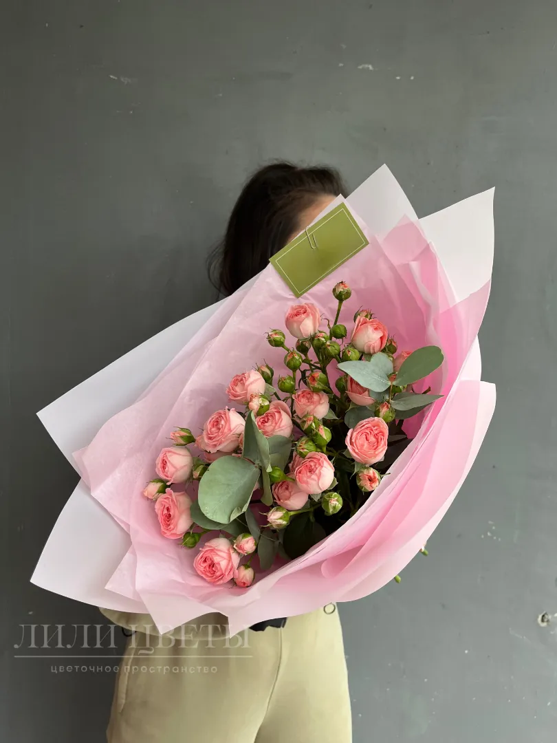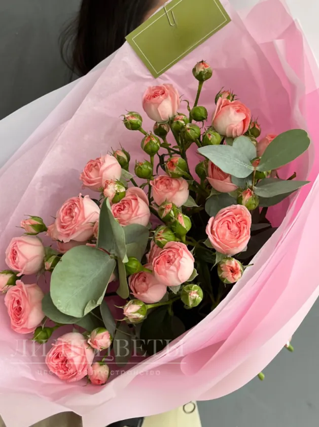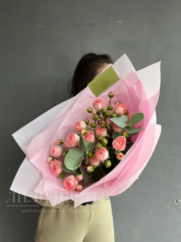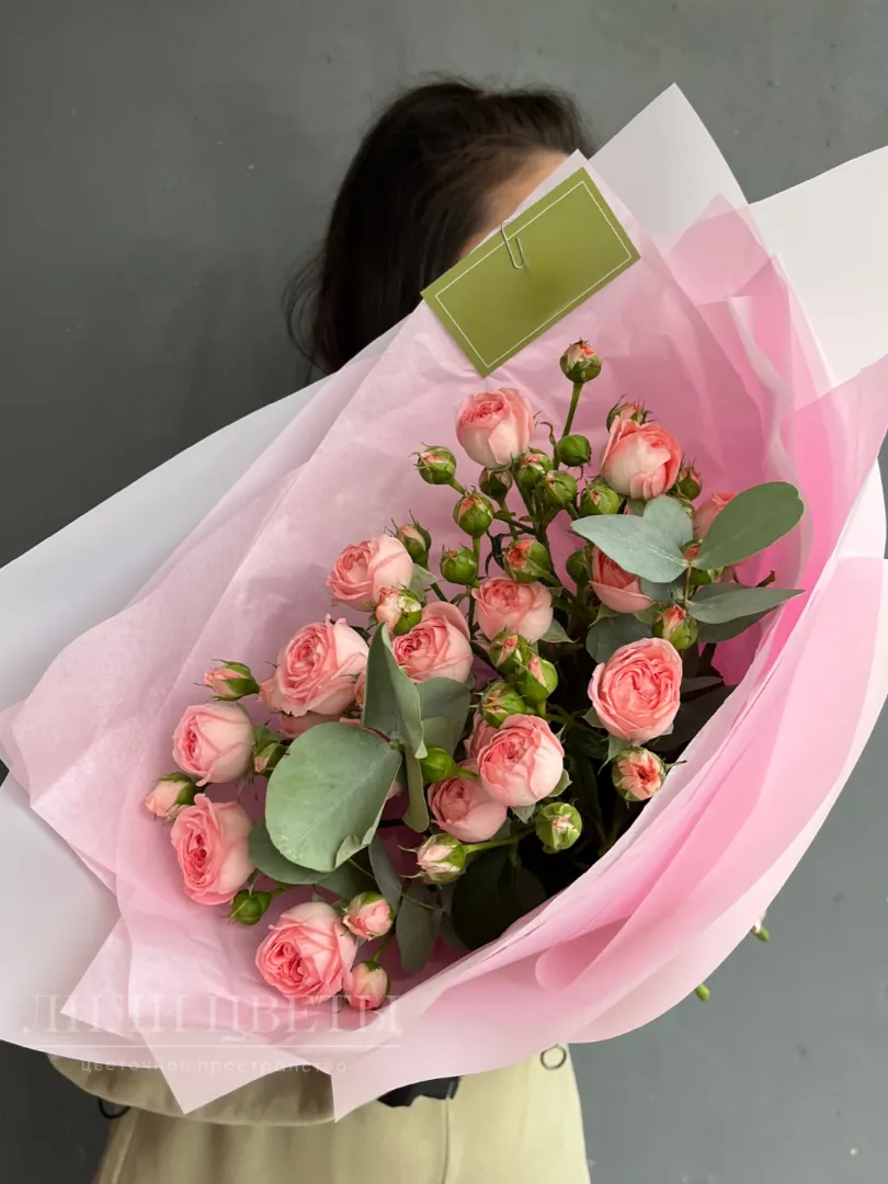 Монобукет из розовых кустовых роз с эвкалиптом - это изысканный букет, сочетающий нежные оттенки розовых цветов с ароматными зелеными листьями эвкалипта.
