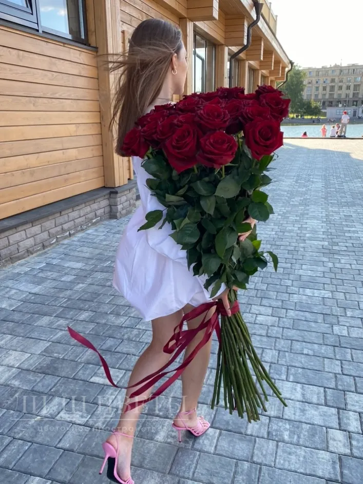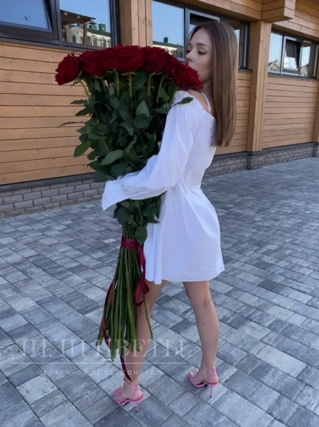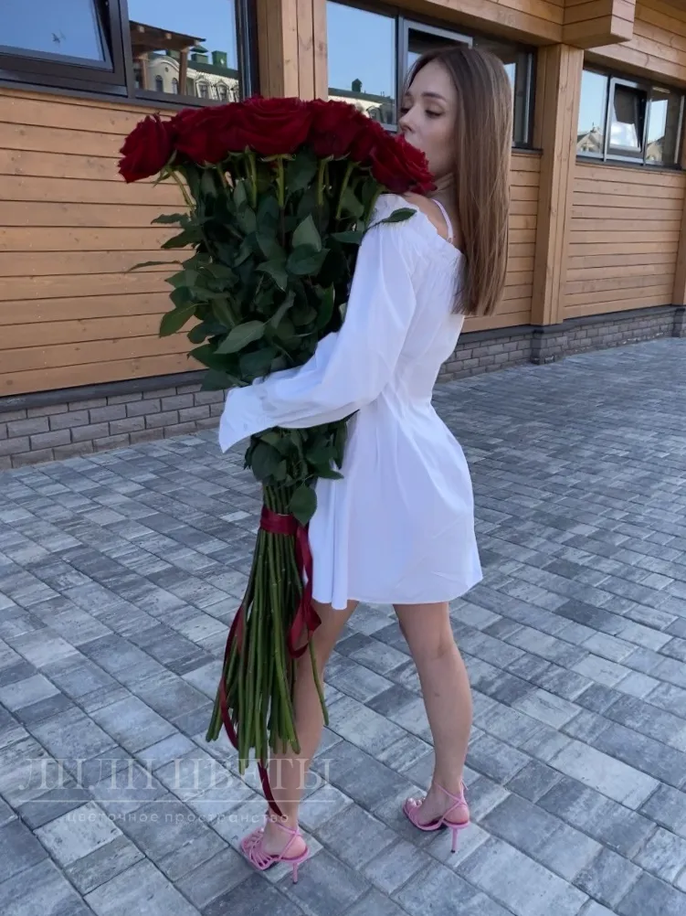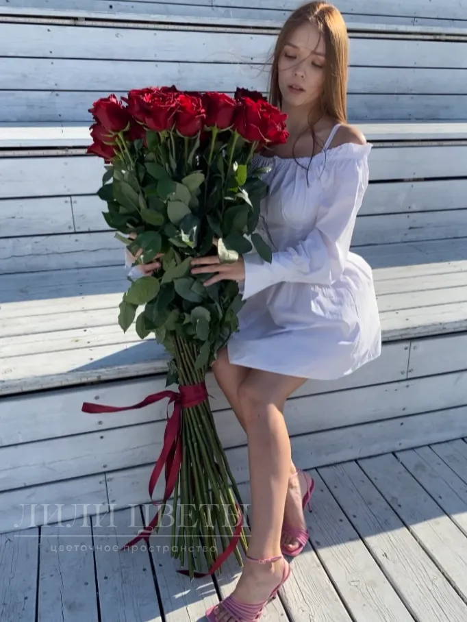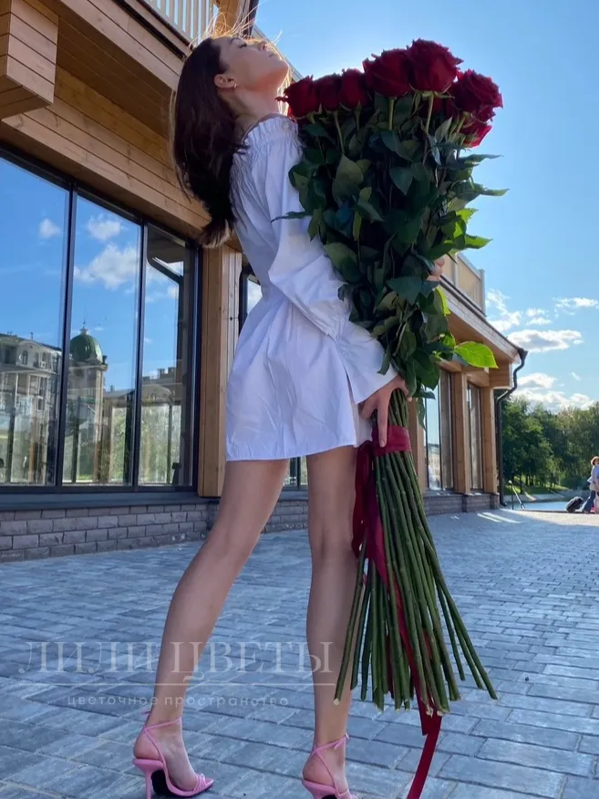 Этот великолепный букет из красных высоких роз выделяется своей элегантностью и страстным изыском, олицетворяя глубокую любовь и романтику в каждом своем лепестке.