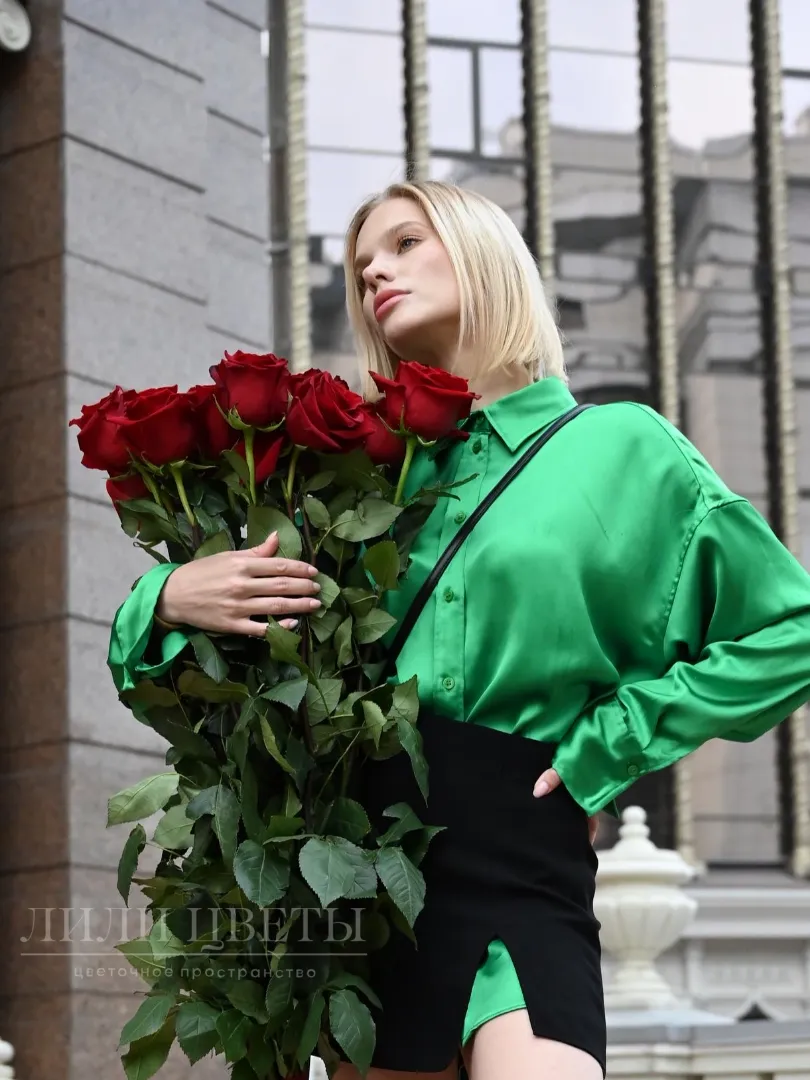 Каждая роза, сияющая ярким красным оттенком, передает силу и элегантность, делая его идеальным подарком для выражения глубоких чувств и нежных эмоций.