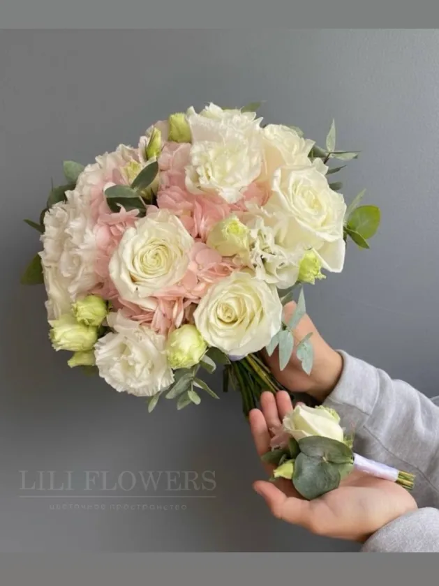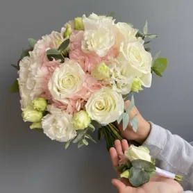 Уникальное сочетание различных цветов и текстур, создающее эффектный и индивидуальный образ для невесты. Свадебный букет включает в себя разнообразные цветы, такие как розы, эустомы, гортензию и эвкалипт, который придает композиции свежести и динамичности. Каждый цветок выбран с учетом его символики и гармонии с другими элементами, что делает букет не только красивым, но и значимым.