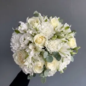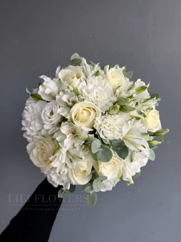 Искусно составленный букет, который сочетает в себе разнообразные цветы и зелень, создавая уникальный и запоминающийся образ для невесты. Букет включает в себя как классические цветы, такие как розы и диантусы, так и экзотические - альстромерия и эустома. Каждый элемент выбран с любовью и вниманием к деталям, что позволяет создать гармоничное сочетание цветов и текстур.