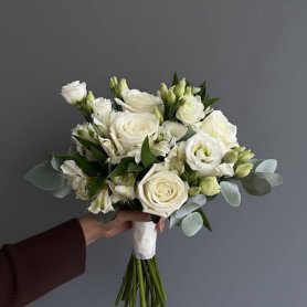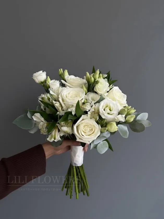 Великолепная композиция, представляющая собой сочетание различных цветов и зелени. Он позволяет невесте выразить свою индивидуальность и стиль, объединяя в себе как традиционные розы, так и экзотические альстромерии и эустомы. Использование эвкалипта добавляет свежести и естественности. Такой свадебный сборный букет станет не только прекрасным аксессуаром для невесты, но и символом её уникального стиля и настроения в этот особенный день.