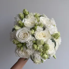Свадебный букет из роз и эустомы объединяет в себе нежность и изящество. Розы, олицетворяющие романтику и страсть, прекрасно дополняются утонченными эустомами, символизирующими искренность и верность. Мягкие лепестки роз и изящные цветы эустомы создают интересное сочетание форм, придавая букету объем и выразительность. Этот букет станет не только чудесным аксессуаром, но и символом любви и счастья в самый важный день жизни.