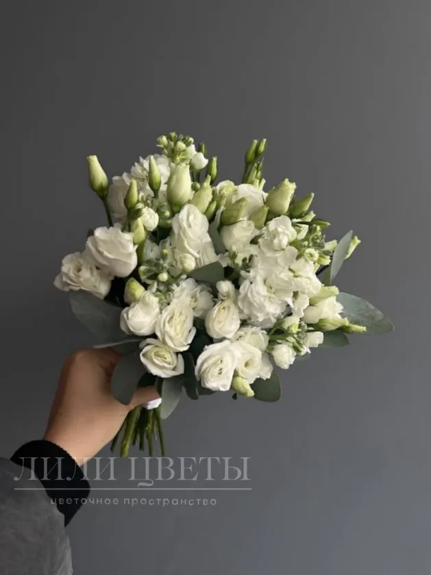 Утонченная и изысканная композиция, которая сочетает в себе нежность, легкость и свежесть. Эустома с её нежными и грациозными лепестками, символизирует искренние чувства и преданность, а маттиола, известная своим сладким ароматом и яркими цветами, добавляет нотку романтики и элегантности. Эвкалипт придаёт букету текстуру и естественность, создавая гармоничное сочетание с цветами. Букет станет не только великолепным аксессуаром, но и символом любви и счастья!