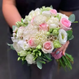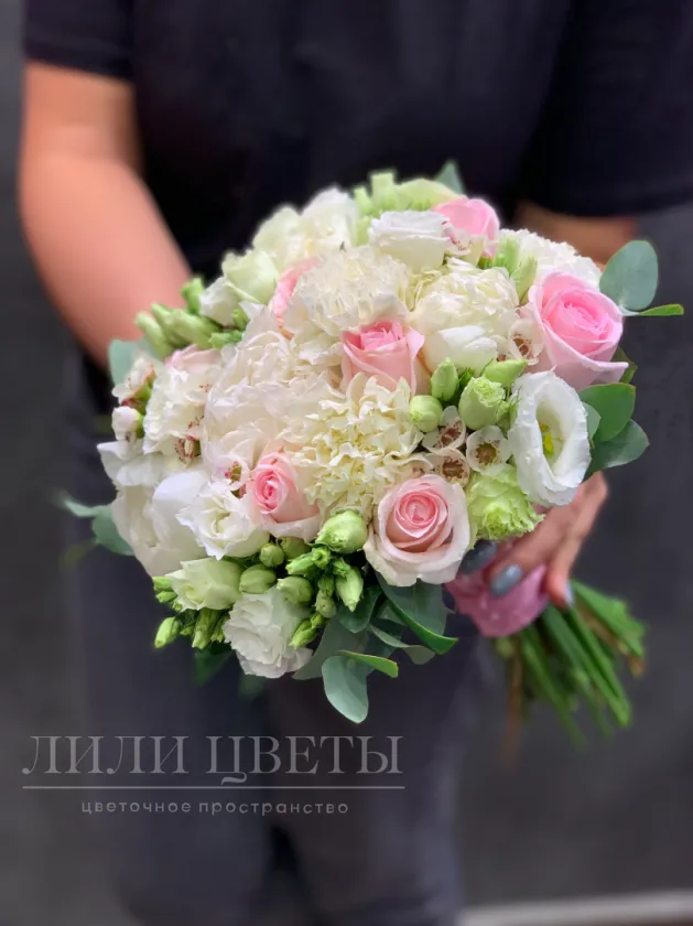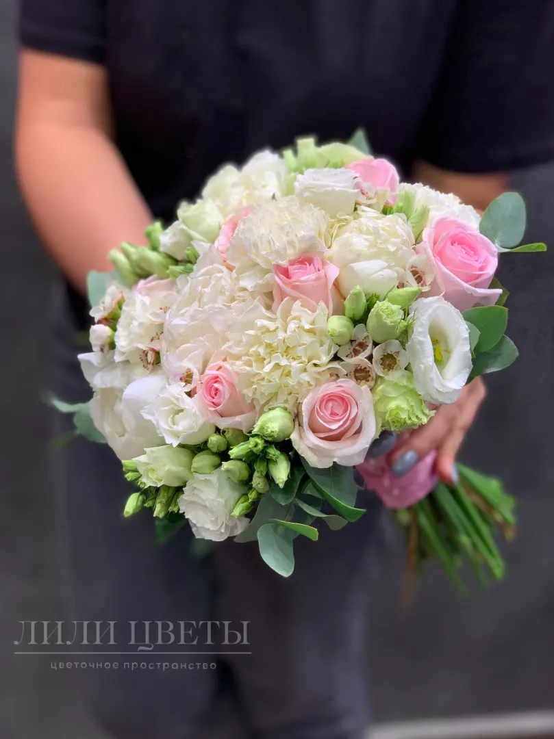 Этот великолепный свадебный букет изящно сочетает в себе красоту гвоздик, пионов, эустомы и роз, создавая нежный и романтический образ.